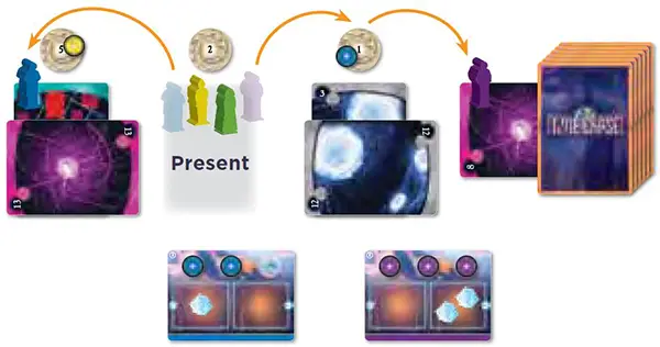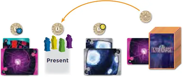 Players may now choose to move their travelers backward or forward in time. When secretly choosing how much fuel to spend, each player should place it in the box of their choice on their time machine card, indicating which direction they wish to travel in the timeline.