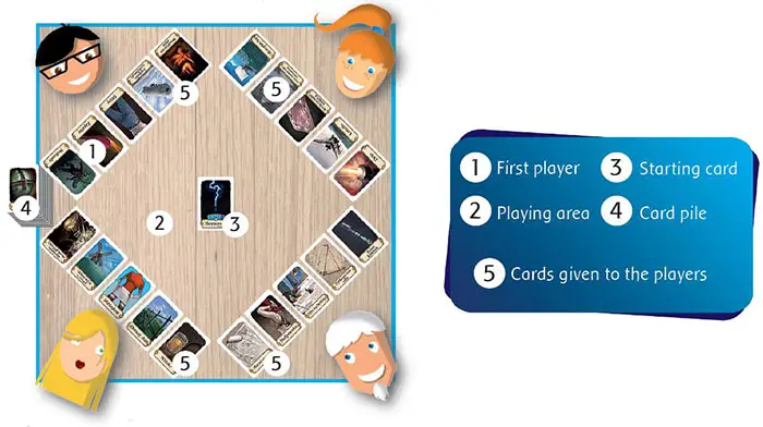 Number of players 2 to 3 4 to 5 6 to 8 Number of cards 6 5 4 Experienced players are free to agree to start the game with a different number of cards, based on their level of experience with the game. It is often more challenging to have more cards in front of you.