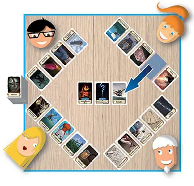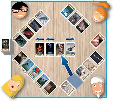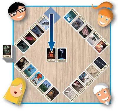 The game is played over a number of rounds. In each round, the players take turns to play, going clockwise. A round is complete only after all players have taken a turn. To begin the game, the first player must play one of his or her cards next to the starting card (the one placed in the middle of the playing area during set-up):