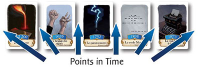 After a card is played, turn it over so the "date" side is showing, and check that the card has been placed properly in the chronological timeline: