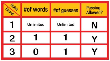 Round 3 plays just like Round 2, with the following change: The Cluegiver may not use any words at all. Only sounds and pantomime.