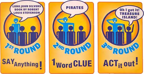 Round 3 plays just like Round 2, with the following change: The Cluegiver may not use any words at all. Only sounds and pantomime.