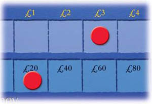 Players move their tokens back along the track when they spend their money, and forwards when they receive money. The bottom track is used to record multiples of £20.
