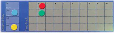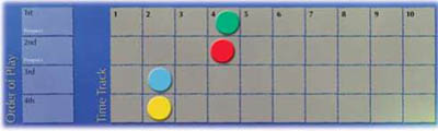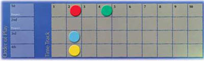 Example 3: The red player performs an action that uses two points of time. This takes him to the '4' space. As green already occupies the top space red must go in the space underneath. Blue would now be the active player. If blue also used two Time Points then his token would end up being placed in the space under the red token.