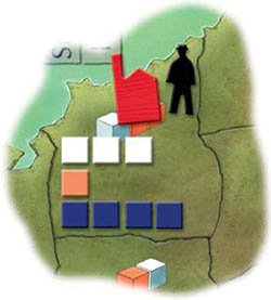 Example: In example above blue places a train in the area indicated. Two water cubes are removed from that area, and one from each adjacent area. The Mining Capacity in the area with the train will now be three.