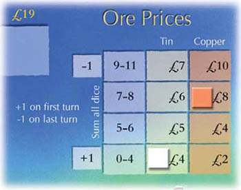 In following turns the old price may affect the new price of ore. If the old price was at the highest level then subtract one from the total shown on the dice. If the old price was at the lowest level then add one to the result shown on the dice.