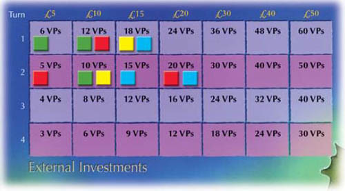 To place a cube in a box you must pay the amount shown at the top of the column. You adjust your Money total accordingly. The box shows how many victory points you will score at the end of the game. Note that the value of investments declines over the course of the game. Also note that External Investments is the ONLY way to score victory points in the game!
