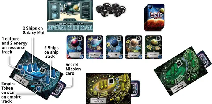 Shuffle the Secret Mission Cards and deal two to each player. Each player looks at both, selects one and slides it under their Galaxy Mat, then discards the other.
