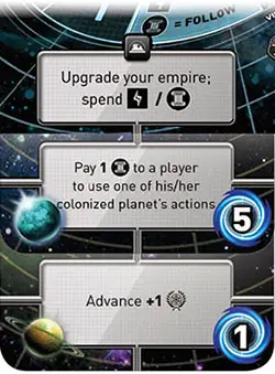 Spend the number of resources equal to the next level of your empire track. This cost must be paid either entirely in energy or entirely in culture; they cannot be combined.