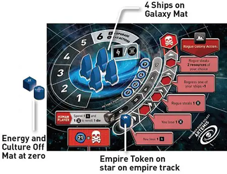 The Rogue Galaxy acquires resources just as if it were a player, except that its galaxy produces both energy and culture. At the end of its turn, if a resource marker is at max level, a special action occurs: