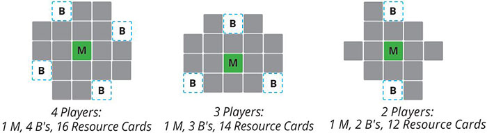 J Based on the number of players, arrange the Arena according to the diagrams below. For the Resource Cards (
