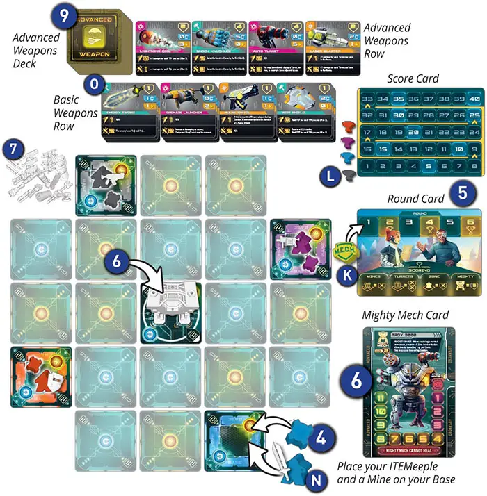 Equipping Basic and Advanced Weapons: Place the cards face-up into the labeled slots on the Pilot or Mighty Mech Card and the corresponding Weapon Items into the slots on the ITEMeeple, Power Armor, or Mech you control.