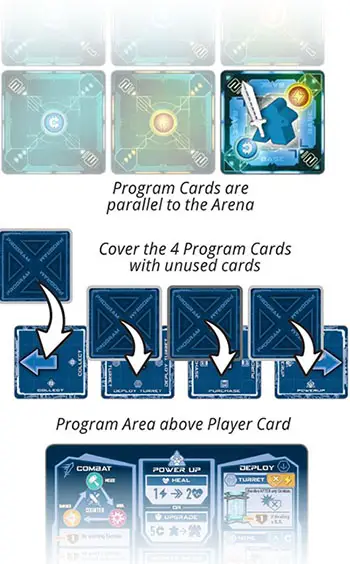 The players then lay them out face- up, in order from left to right in the area above their Player Card (called the "Program Area"). Then each card is immediately covered by a face-down unused card to keep them secret from the other players.