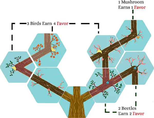 Example: Sam has a tree with 3 Birds, 2 Beetles, and 1 Mushroom. The Mushroom earns 1 Favor, the Beetles earn 2 Favor total, and the Birds earn 4 Favor total.