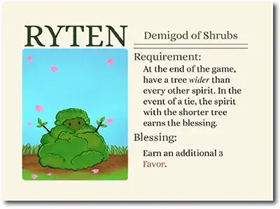 Example: If the Blessing of Ryten is revealed, the spirit with the tree of the greatest width that you can measure with a ruler earns an additional 3 Favor at the end of the game.
