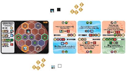 3 Requirements: Each Project requires that you have access to a certain number and type of Tags. The Tags can come from any combination of your Project Cards (see #6), your cities on bonus hexes, and from spending (discarding) Resource Tokens.