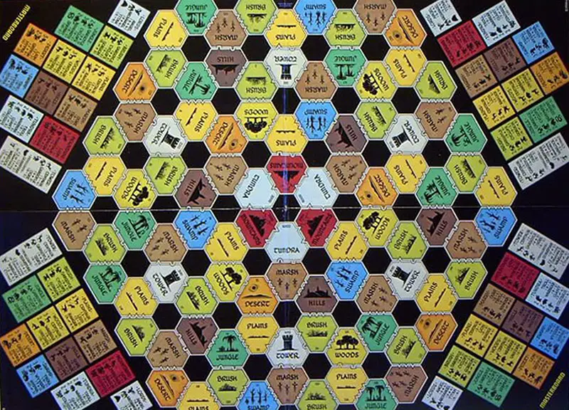 The battlelands are displayed on the front and back of six separate sheets. They are the arenas of Battle. Each Battleland depicts one of the 11 types of terrain of the Masterboard and is divided into 27 hexes.
