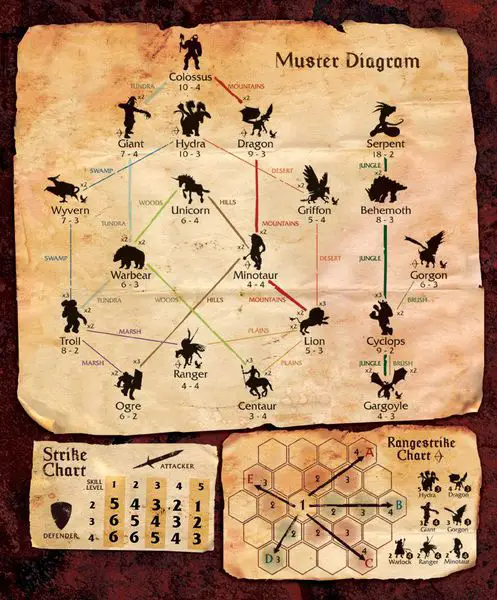 Creatures are listed on the Mastercharts beneath the terrains where they are found. They are listed according to their values, with the lesser Creatures listed first. The numbers in parentheses are the Creatures' Battle-factors. The numbers to left of the character's name indicate how many of that type a Legion must already contain to be qualified to muster a Creature of the next larger size.