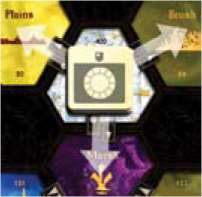 Gray has rolled a two. If he wishes to move this legion, he must move through the block to the mountain. From there, he may go either left or right.