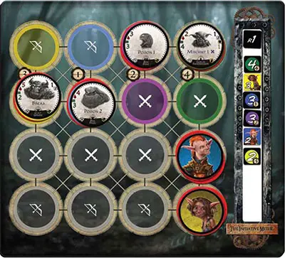 The Bog Frog moves 2 positions towards its closest target (Picket is 3 positions away, and Boomer is 4). Go ahead and move it to either position adjacent to Picket. The Bog Frog does not have any dice to roll, but it does have a Skill that triggers each turn. In this case, place a Poison Effect Die, set at 2, on Picket's chip.