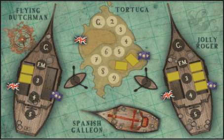 In this example, if the Spanish Armada was revealed the French would win since they have 5 total treasures (3 on the Jolly Roger, and 2 on Tortuga), and the British only have 3 (2 on the Flying Dutchman, and 1 on the Jolly Roger.