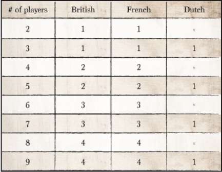 Players are divided into teams of British and French pirates. In games with an odd number of players, there will also be a Dutch pirate. You will begin the game on either the Flying Dutchman or the Jolly Roger, but the other players on your ship will not necessarily be on your team.