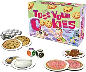 Be the first player to collect five of a cookie plus the milk by passing, swapping, and tossing cards according to the dice rolls.