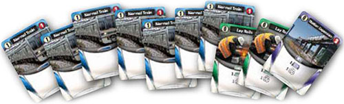 3. Each player takes 7 Normal Train, 2 Lay Rails, and 1 Station Expansion for a total of 10 cards, shuffles them, and places them face down in front of him. This forms the player's starting deck.
