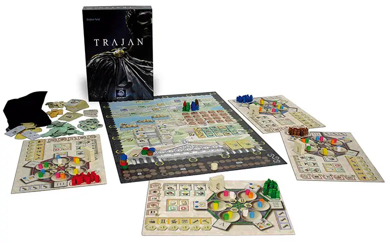 If a Trajan tile lies next to the target tray and if there are action markers in the tray matching the colors shown on the tile, the player removes the tile from their player mat, gains the corresponding victory points and may perform the appropriate special action.