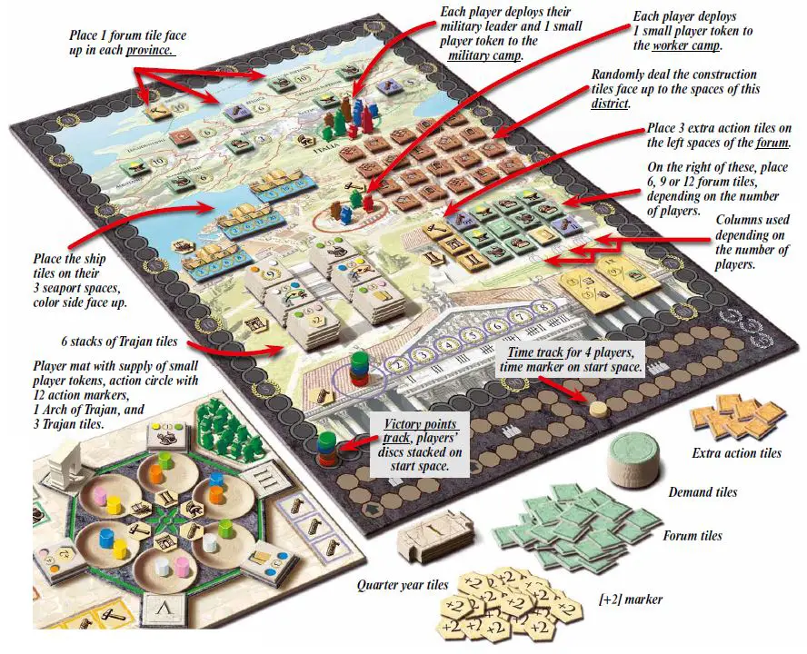 Unfold the game board in the center of the playing area. Give each player in their chosen player color 1 player mat, 1 military leader token, 15 small player tokens, and 2 discs to record their victory points and their position in the senate. Additionally, each player receives 1 Arch of Trajan and 12 action markers (2 pieces of each color - blue, yellow, light green, orange, pink, and white).