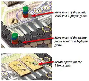 Players determine a start player by any method they like. The start player places one of their discs on the start space of the senate track. In clockwise direction, the other players pile up their discs atop the other discs, thus creating a small stack.