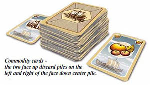 Beginning with the start player and continuing in player order, each player draws 3 commodity cards, keeping them on their hand. Each player may take cards from any pile in any combination; whenever a discard pile is empty, it is filled up with the top card from the face down pile.