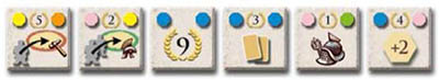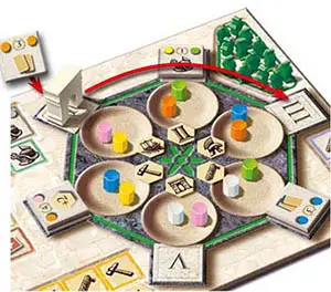 The key to success is the canny allocation of action markers to the trays of the action circle. Players try to catch the best time for certain actions. On the one hand, it is important to make use of sudden chances, e. g. to get hold of attractive tiles, on the other hand players must not neglect to give other players a hard time in crucial situations. Additionally, players may scheme relevant actions a few turns in advance.