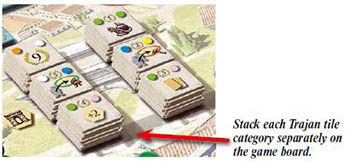 Now, sort the Trajan tiles by category (icons), shuffle each pile and allocate the stacks to their 6 spaces on the game board.
