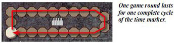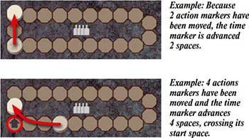 After the active player has announced the number of their selected action markers, their right neighbor advances the time marker that many spaces on the time track in clockwise direction.