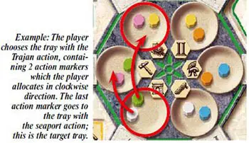 Regardless if the player had accomplished a Trajan tile or not they may now perform the action assigned to the target tray. A unique action is assigned to each tray of the action circle. The following actions are at the players' disposal: