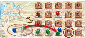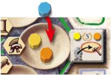 Example: The last action marker added to the tray is a blue one. The tray also contains the 2 action markers required to accomplish the Trajan tile. The player gains 5 victory points and may deploy one of their small player tokens to the worker camp. The Trajan marker is removed from the game subsequently.