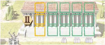 Example: The player places their new Trajan tile on the slot currently occupied by their Arch of Trajan ("I"). Then, they move the Arch to the next free slot in clockwise direction ("III").