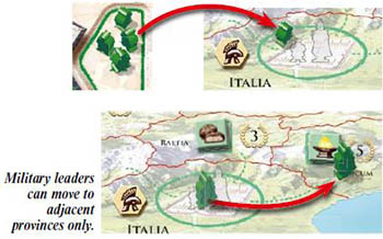 Please note: Legionnaires do not move from province to province, they go straight to the province of their leader. Players never gain less than 0 victory points for a province.