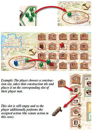 The player takes the top face up tile from one of the six stacks of Trajan tiles and puts it on that slot of their player mat currently occupied by their Arch of Trajan. Then, they slide the arch of Trajan to the next free slot in clockwise direction.