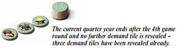 The current game round ends after the active player's turn, if the time marker arrives at its start space of the time track or crosses it. Reveal a demand tile and place it in good view of all players next to the game board.