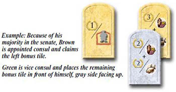 The player controlling the most votes is appointed consul and chooses one of the two bonus tiles on the right of the senate track. They place the chosen tile in front of themselves, yellow side face up.