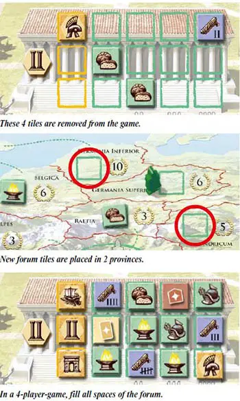 Place a new forum tile in each province without a forum tile currently containing neither a military leader nor a legionnaire.