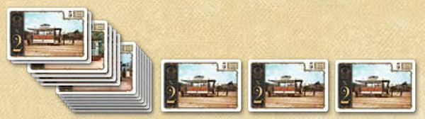Example: There are two horse trains and a steam train in the supply. Since you started 2 more columns this turn, you will need 2 new tramway cards.