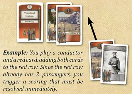 As soon as one of you adds the fourth passenger to the row of a Terminal Station card, a scoring takes place immediately. Both of you must immediately score all of your columns matching the color of the completed row.