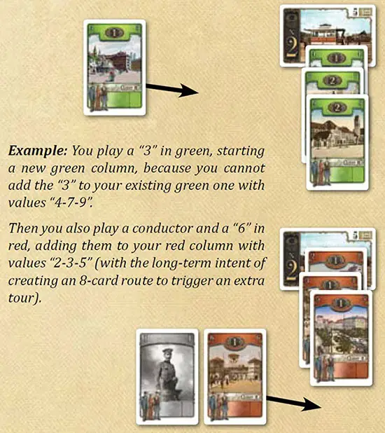 To achieve this goal, you will be building and expanding tramway routes by playing and collecting card-columns in ascending order (see step 2).