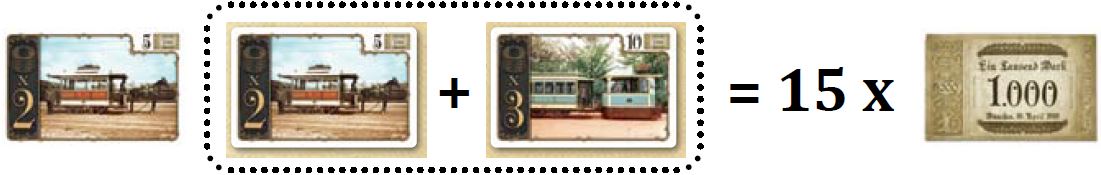 If you have any card columns in front of you without a Tramway Card, remove these cards and place them on your money pile. Finally, draw cards from the draw pile and put them into your hand until you have a hand of 6 cards again.