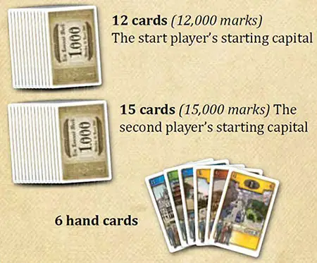 They represent 12,000 marks that you can only use to purchase new trains. Your opponent receives 15 cards from the draw pile, i.e. 15,000 marks to start with. They also may not look at the front sides of these cards.