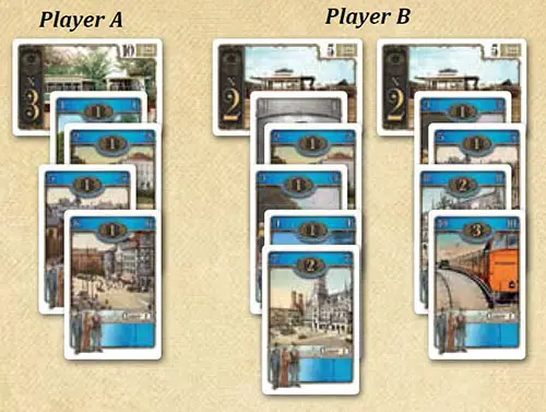 Example: The fourth passenger has been just added to the blue Terminal Station card (not pictured), immediately triggering a scoring of that color. Player A has one blue card column with cards 1-2-5-6 and a steam train (value 3), which is worth 12 points.
