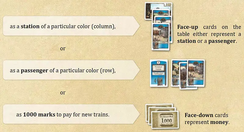 Make some room on the table for the display of passengers. Place the 4 Terminal Station cards in a column such that there is room for another 4 cards as a row next to each Terminal Station card.